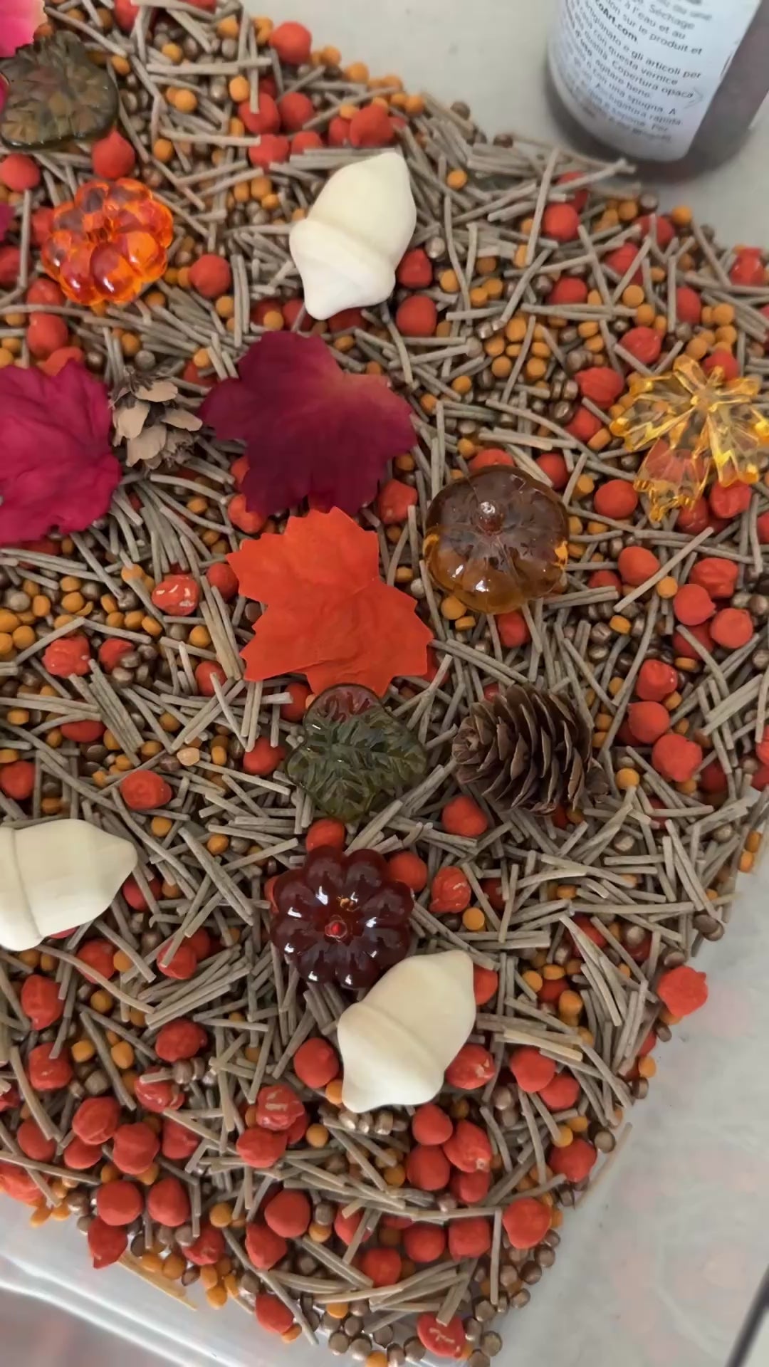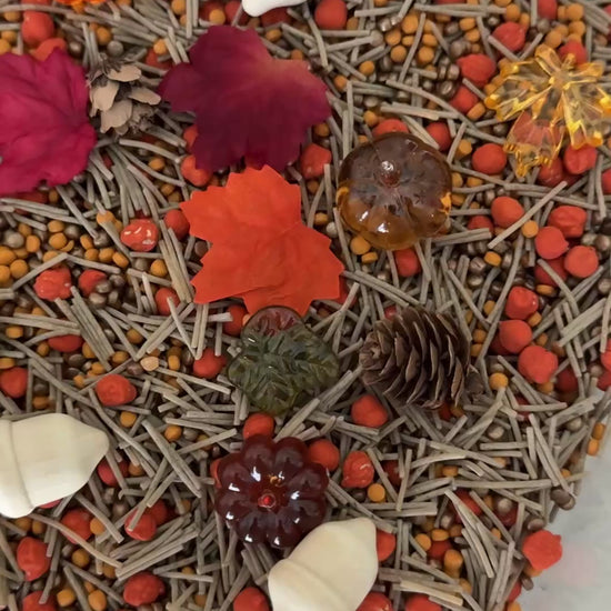 In our Fall themed Pour & Play Bag you’ll find leaves, pinecones, pumpkins, acorns, and a wooden scoop.