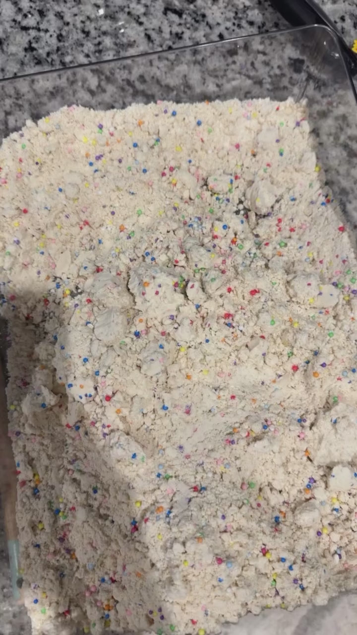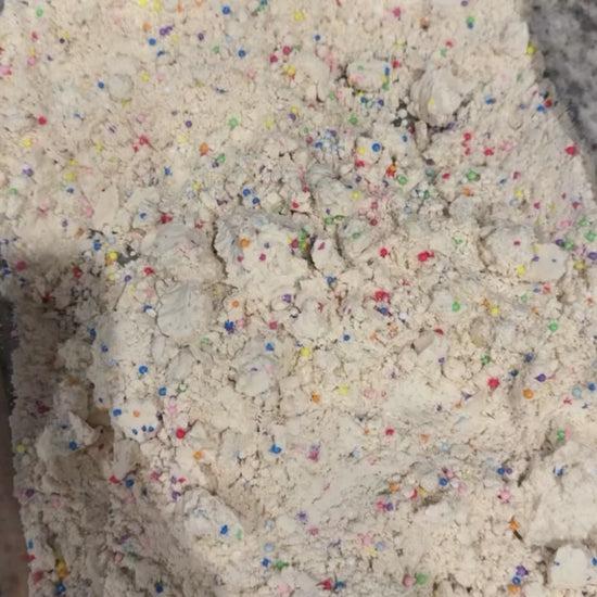 Our Birthday Cupcake Sensory Pour & Play consists of a fun textured play material created with flour (baked for taste safe), cooking oil, and vanilla extract for light scent.