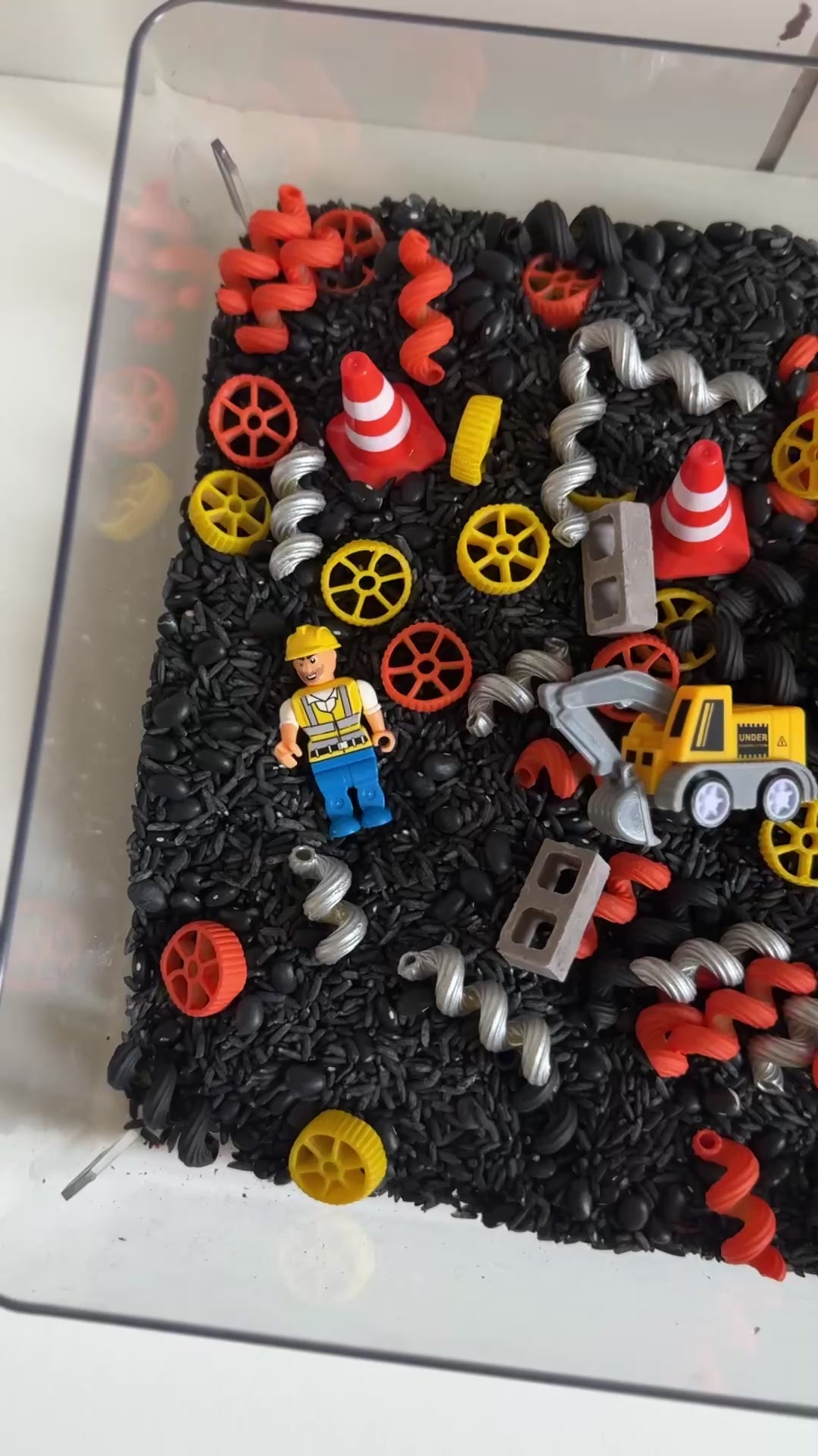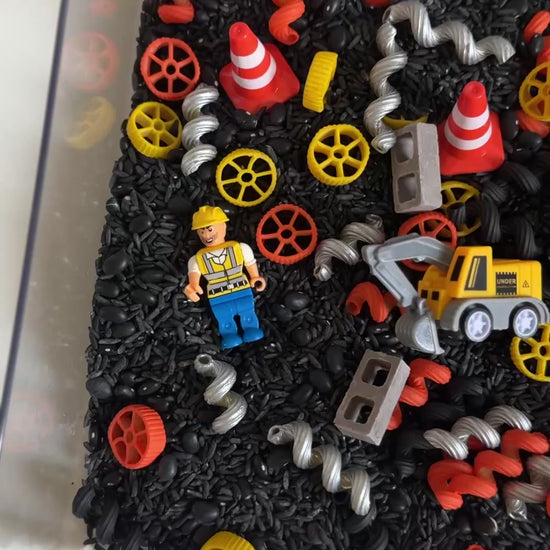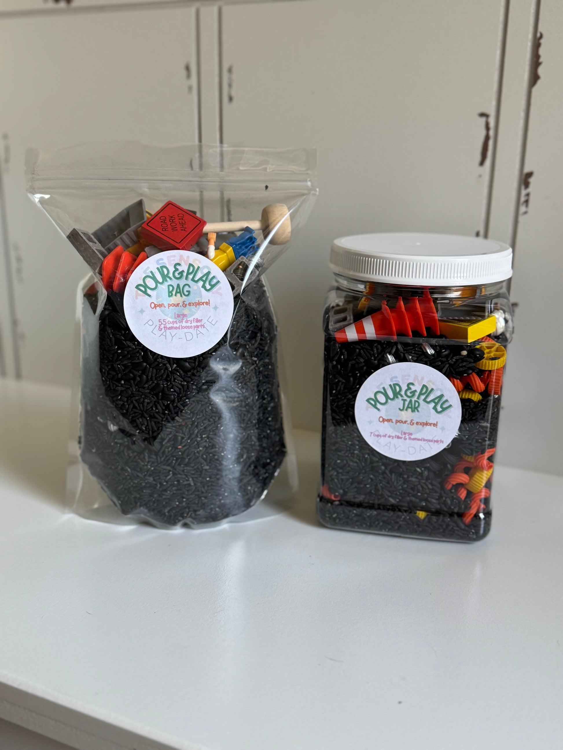 In our “Construction” themed Pour & Play Bag you’ll find high-quality miniature construction trucks (will vary), 6 mini bricks, 4 orange cones, 1 wooden construction sign, 1 worker, and 1 shovel for scooping. Loose parts are the same in bag or jar. Only filler amount is different. See below.