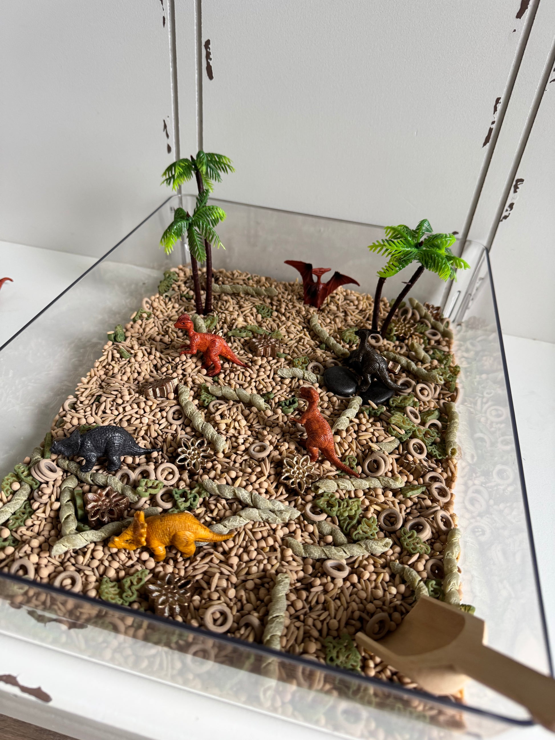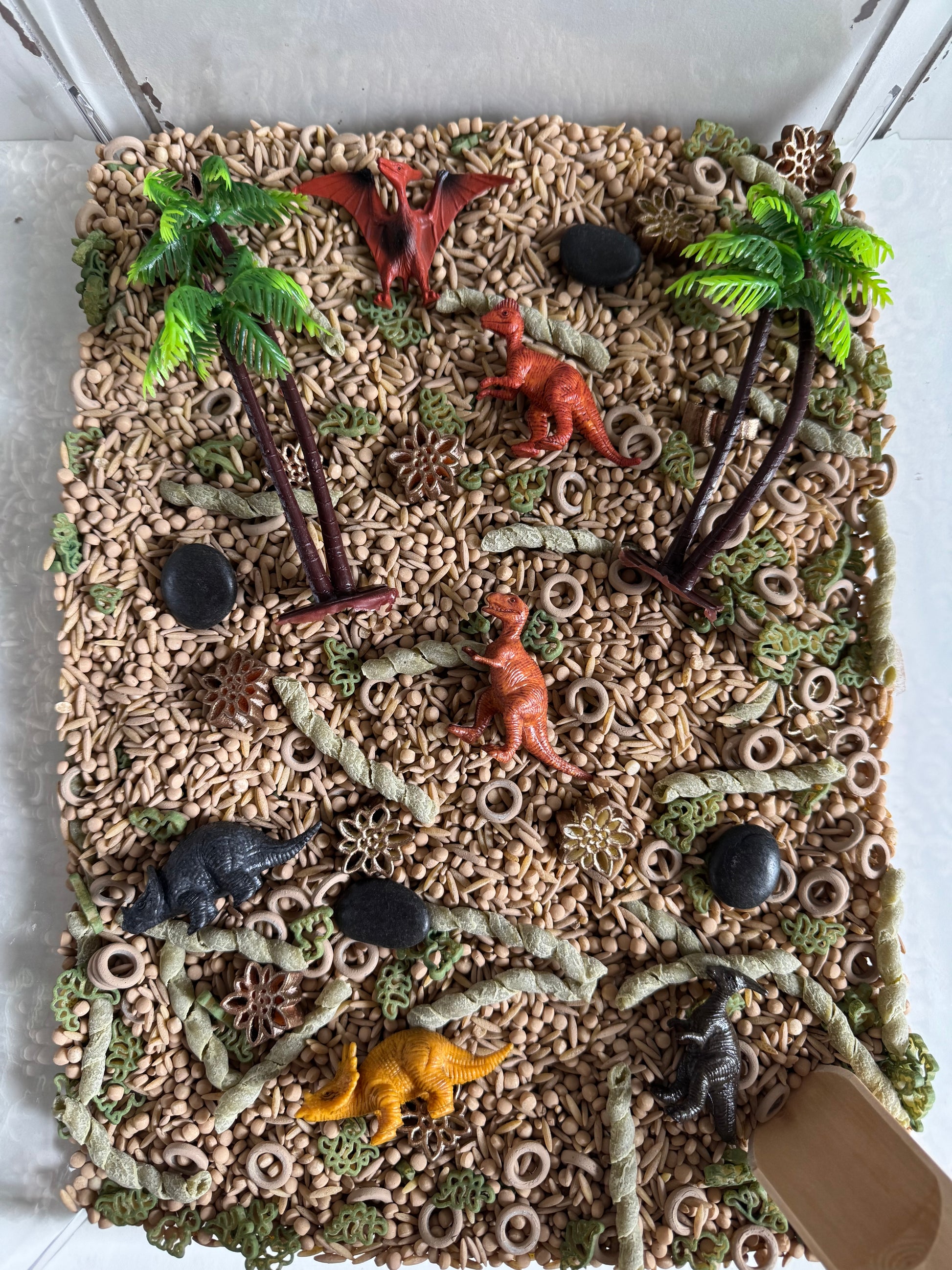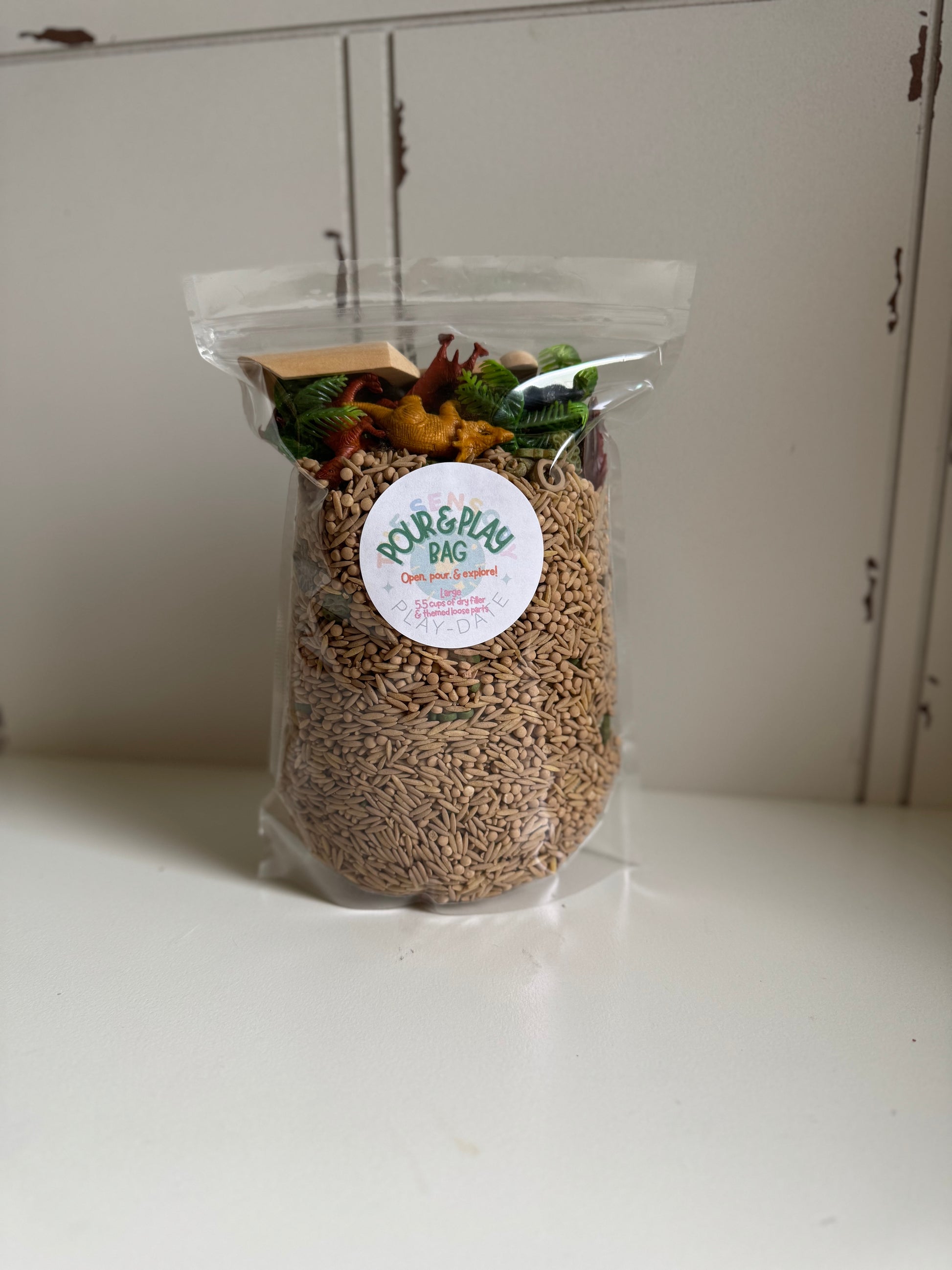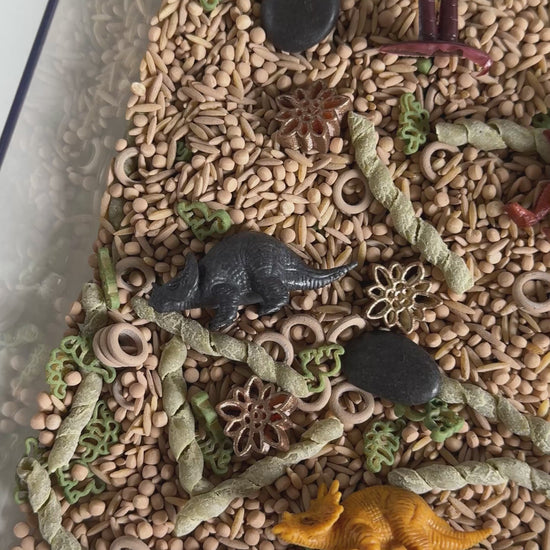 In our “Dinosaur” themed Pour & Play Bag you’ll find 6 high-quality miniature dinosaurs (will vary), 2 plastic palm trees, bones, and rocks (colors may vary). Also includes 1 small wooden scoop.