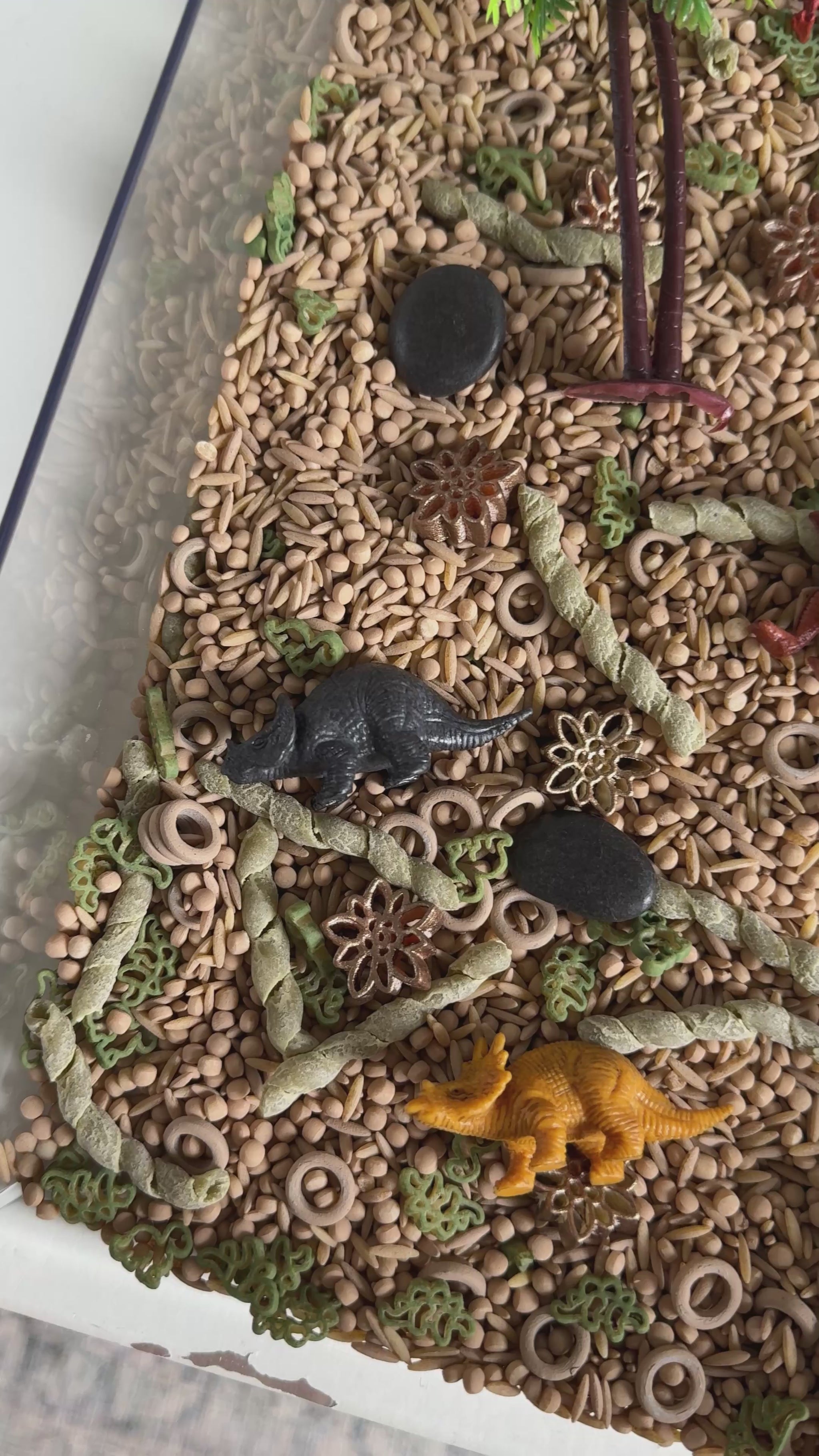 Our Sensory Pour & Play Bag consists of a mixture of dry rice & pastas hand painted with acrylic paint that I call “sensory filler”. In addition to the filler, each jar contains varying themed loose parts.